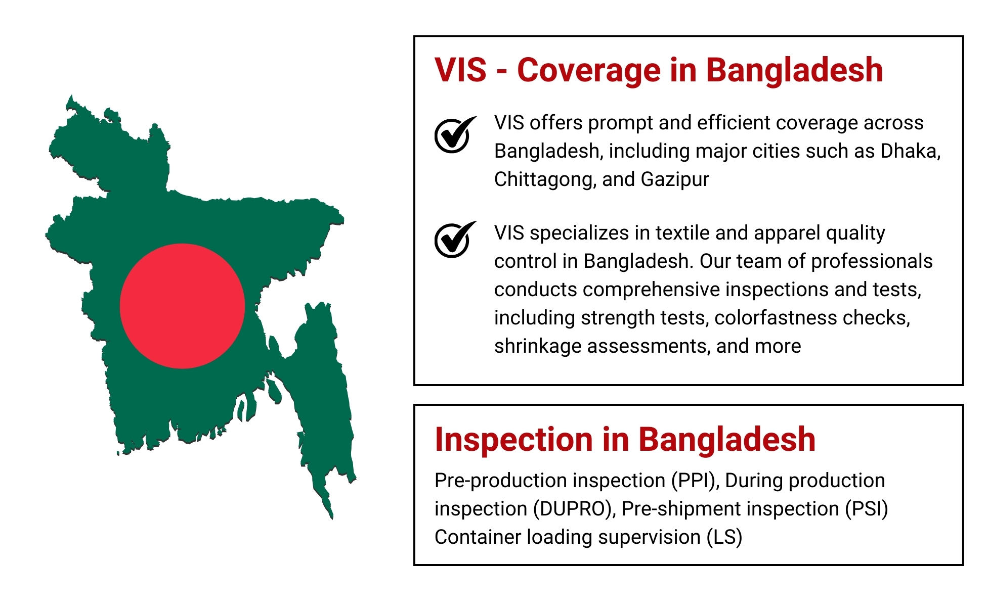 With a strong presence in key exporting cities like Dhaka, Chittagong, and Gazipur, VIS offers prompt and efficient coverage across Bangladesh. Our dedicated inspectors provide on-site inspections within 24 hours and deliver same-day detailed reports, ensuring a streamlined quality control process.
