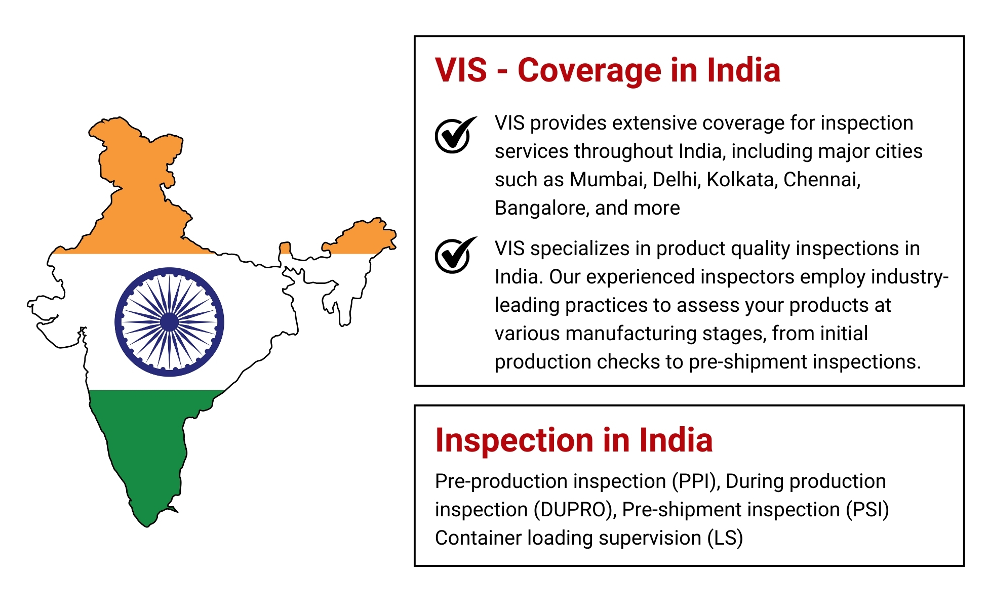VIS provides extensive coverage for inspection in India, including major cities such as Mumbai, Delhi, Kolkata, Chennai, Bangalore, and more. Our network of highly trained inspectors ensures we can effectively serve your quality control needs nationwide.