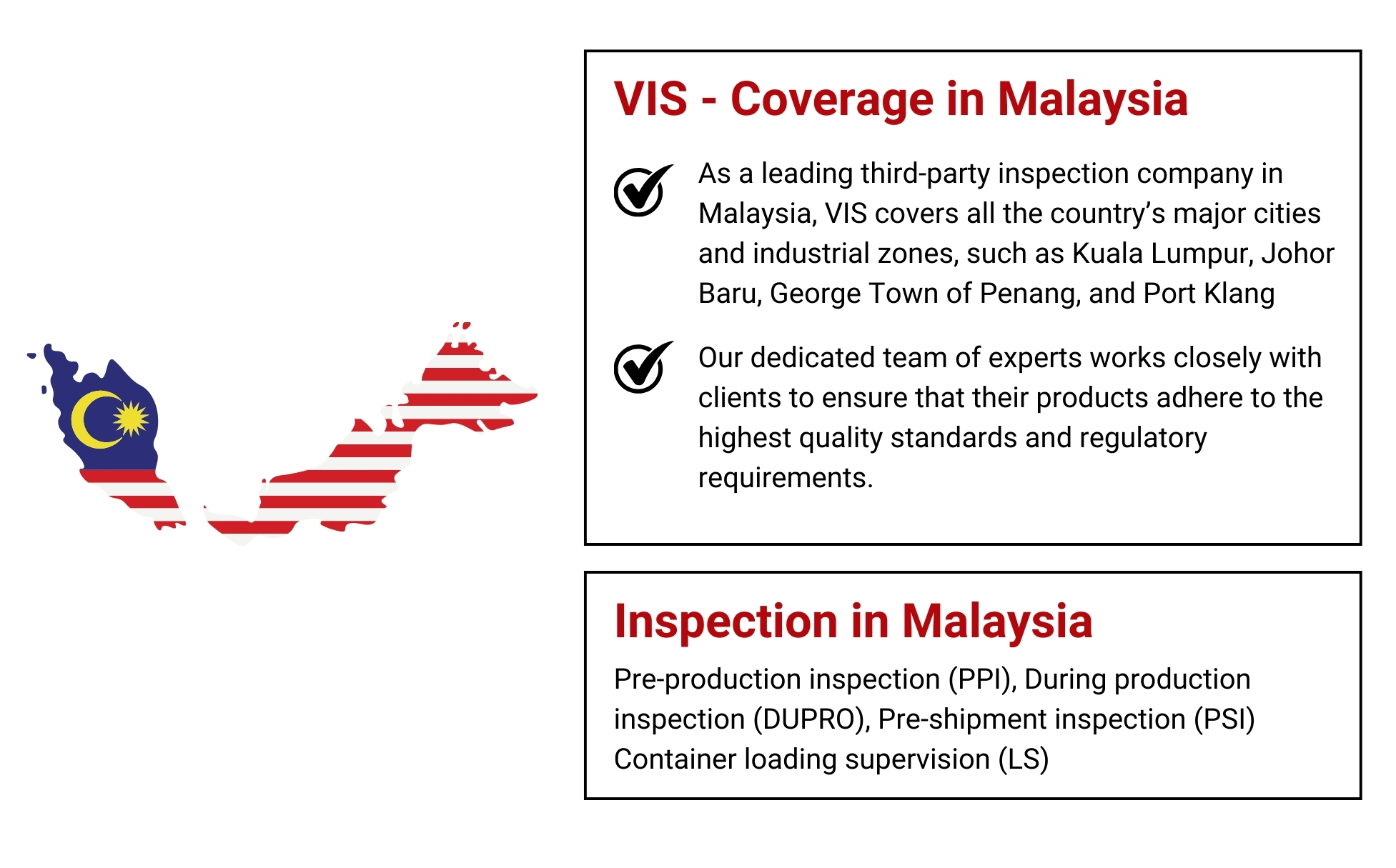As a leading third-party inspection company in Malaysia, VIS covers all the country’s major cities and industrial zones, such as Kuala Lumpur, Johor Baru, George Town of Penang, and Port Klang. This means we can deliver our services quickly and efficiently while keeping your costs low.