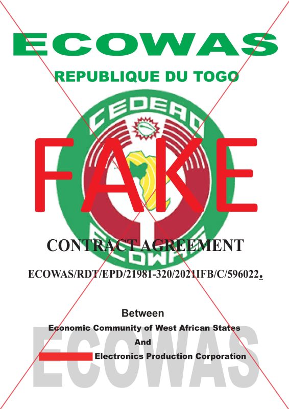 An organization has forged the identity of the organization Economic Community of West African States (ECOWAS) to scam foreign companies. It is suspected that they created a fake website as ECOWAS and contacted us/other factories or suppliers to broker him/his team a supplier of face masks. They placed a large order with a value of up to 37 million USD (details as attached Contract) and offered to pay 100% of the order value. However, we – VIS a.k.a the 3rd party was suspecting when they asked the supplier to pay the attorneys’ rent in advance- which appointed by that fake organization to sign the contract on behalf of the supplier for ~$12,000 because the two parties cannot meet face-to-face due to the epidemic situation.